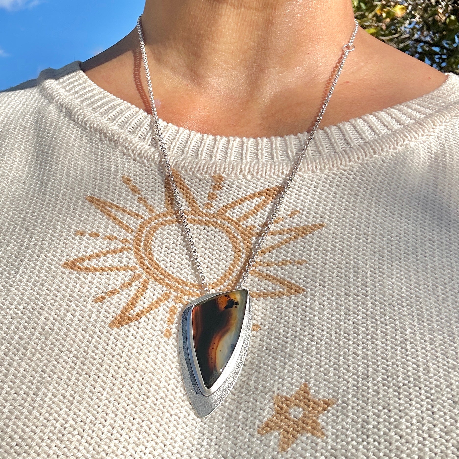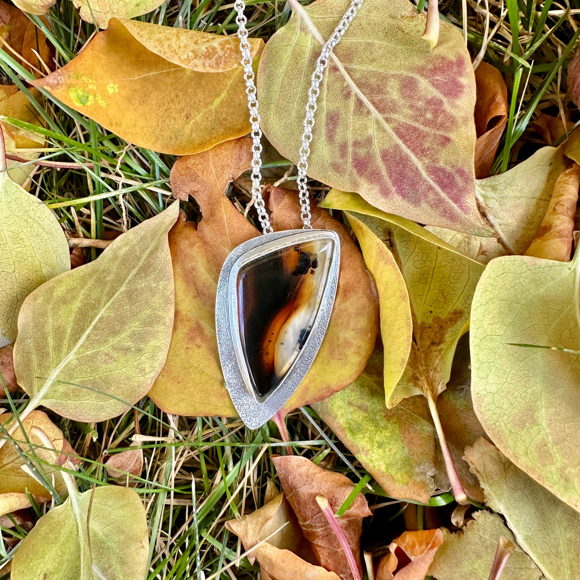 For your love of Montana, this unique pendant features a special Montana Agate cabochon which was cut by Montana Lapidary Artist, Merlin DeShaw.