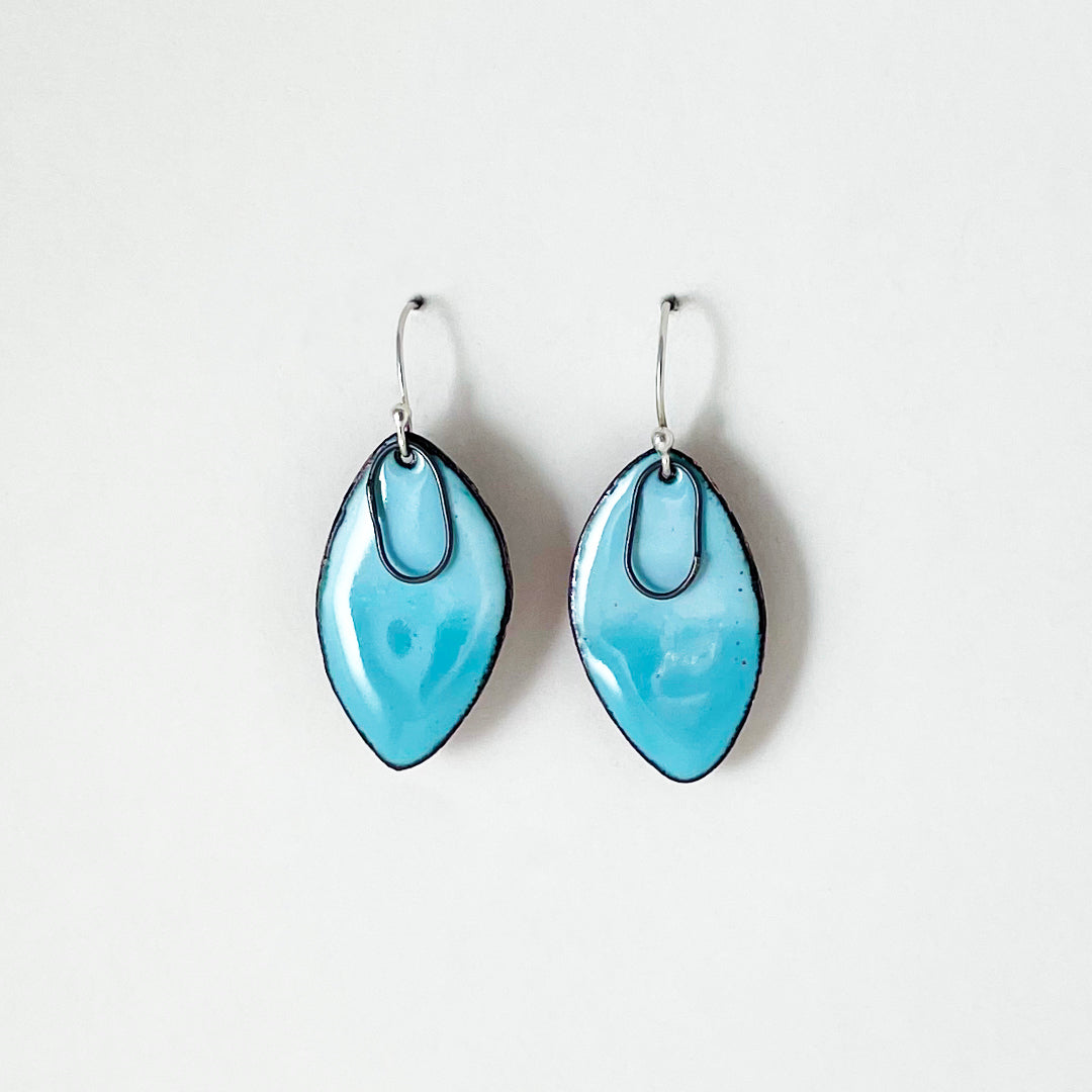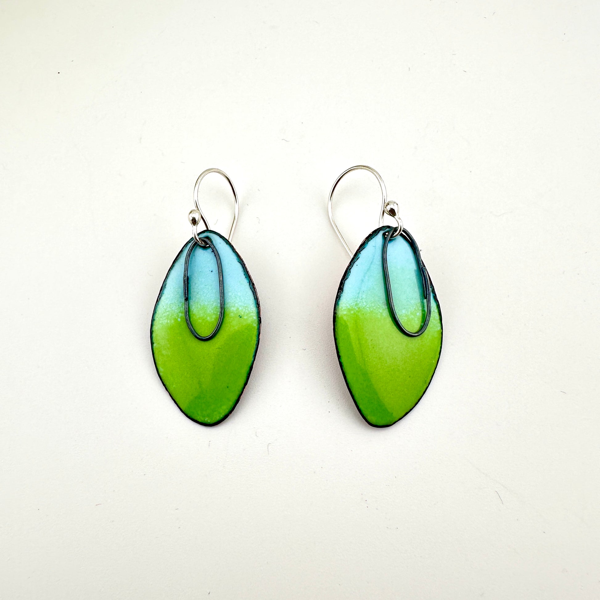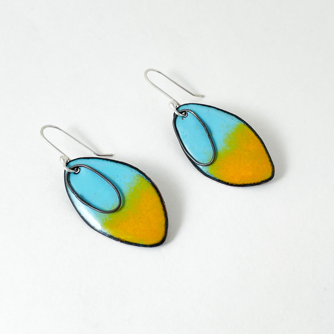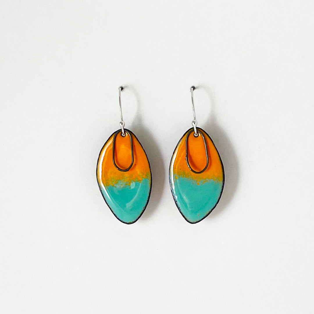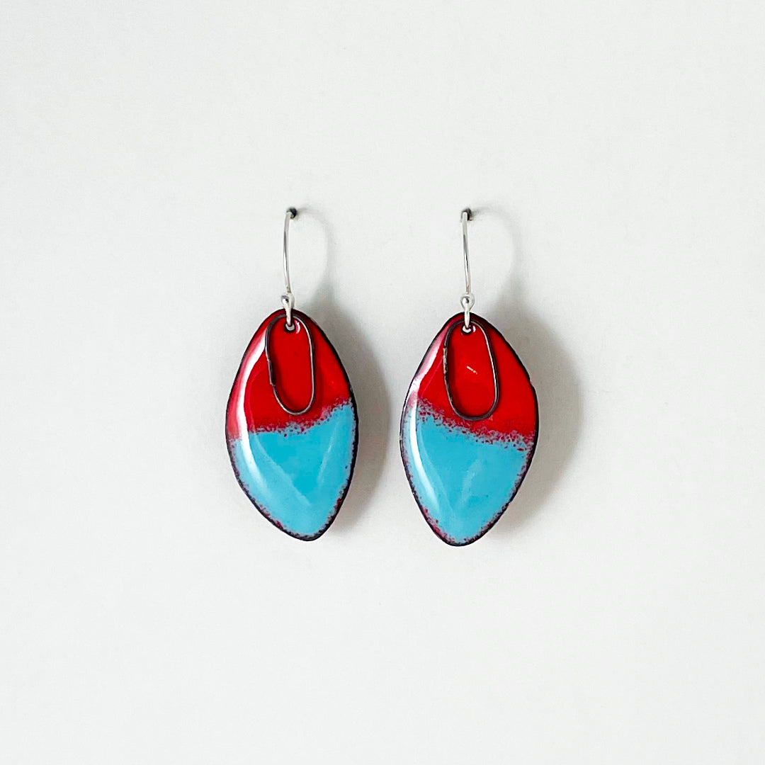 - Copper, glass enamel, sterling silver ear wires, black oxidized sterling findings