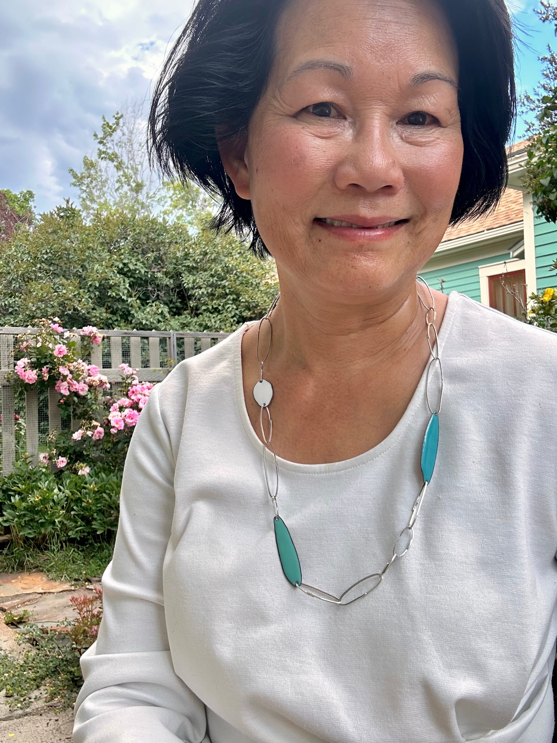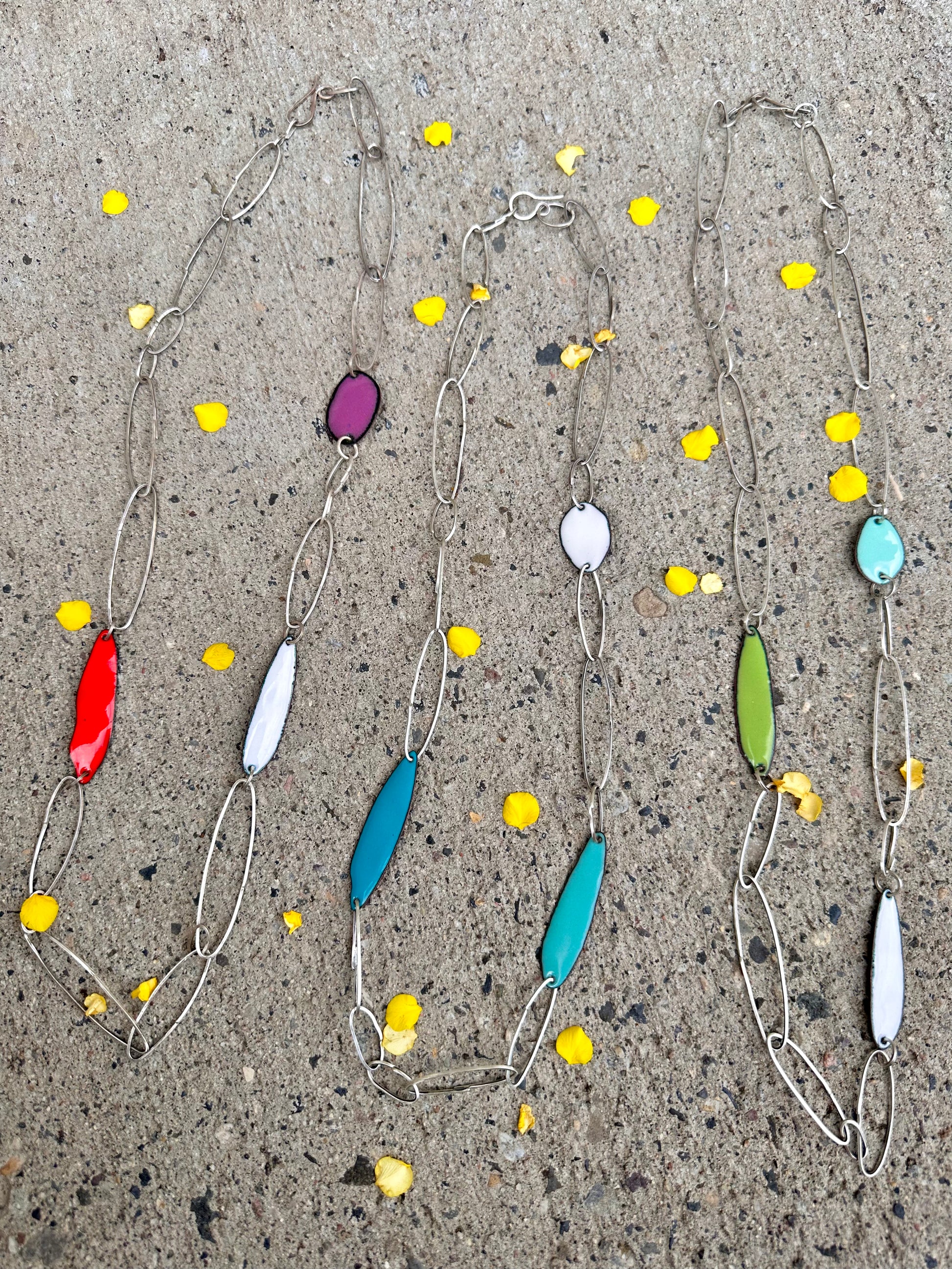 This handmade sterling chain necklace is a labor of love and patience. Each link is hand formed, sanded and soldered to the next link, one by one, until the chain reaches the desired length. The hook & closing link are also hand shaped and soldered. The enamel element are made from copper sheet and fired with opaque enamel glass on both sides. Once assembled, the entire necklace gets a final sanding and polishing. Wear this necklace to celebrate who you are, as you are, and feel the power of you as the unique person you are.