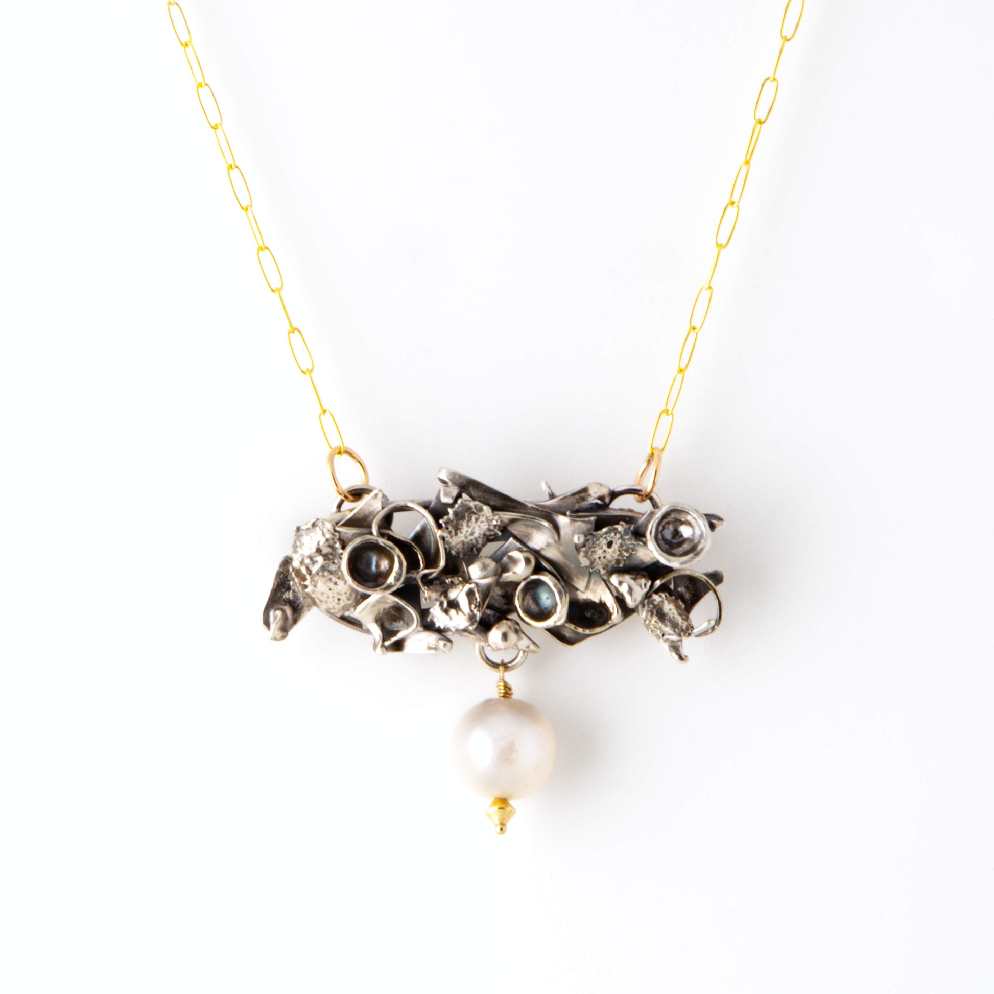 - Hand water casted sterling blooms are soldered on to the abstract pendant which is formed by fusing small sterling shapes together