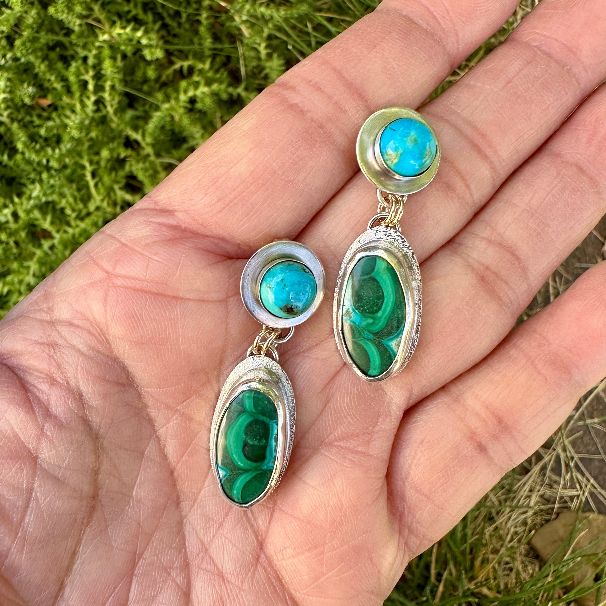 - Stones are enveloped in a fine silver bezel. The Malachite bases are hand textured with a fine point for added interest