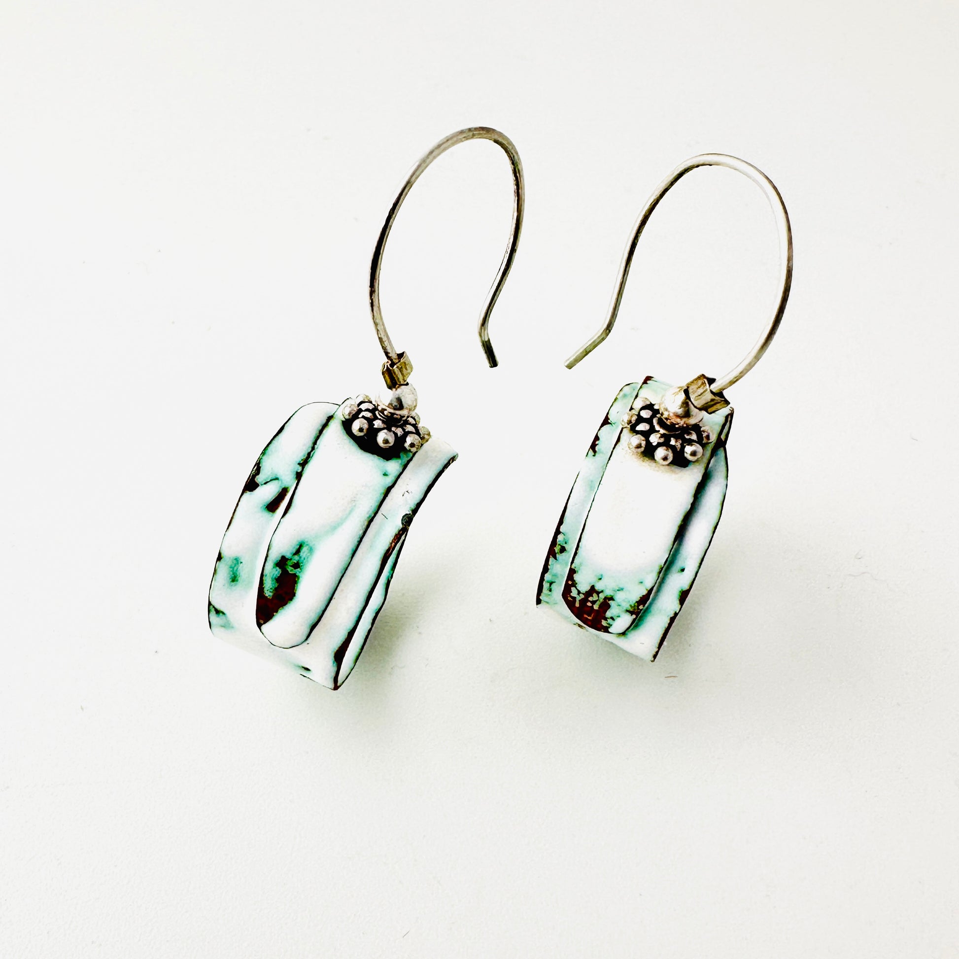 Beveled copper strips carefully shaped into overlapping circles & fired with enamel glass for an organic reuro vibe