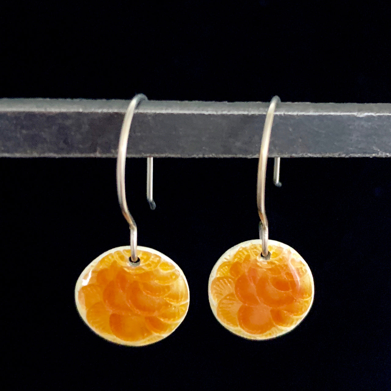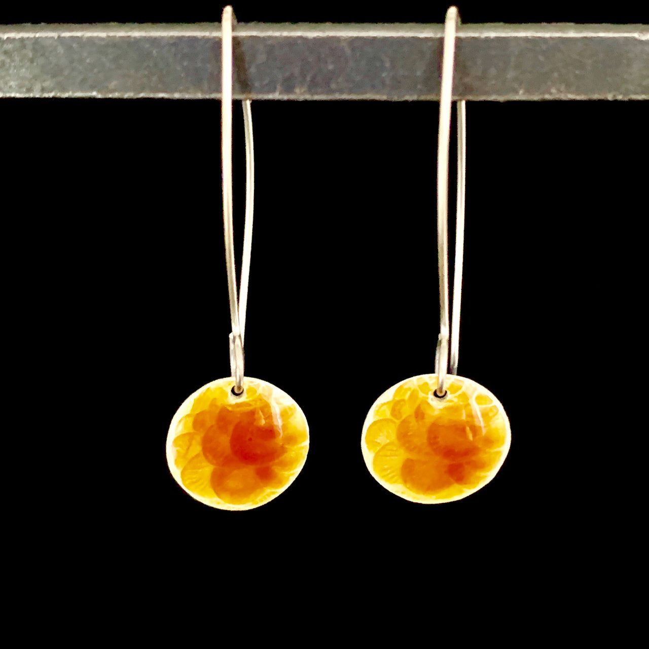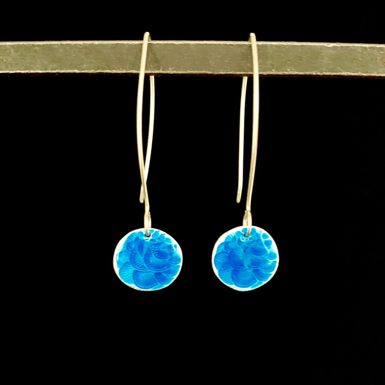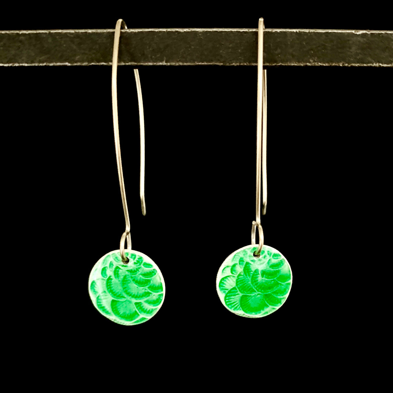 These fine silver enameled earrings are inspired by the delicate feathery wings ("Plume" in French) of South American birds I encountered on a vacation. Fine silver clay and a vintage button are used to hand-shape each disc. Delicate, lightweight and colorful earrings go perfectly with your everyday outfits!